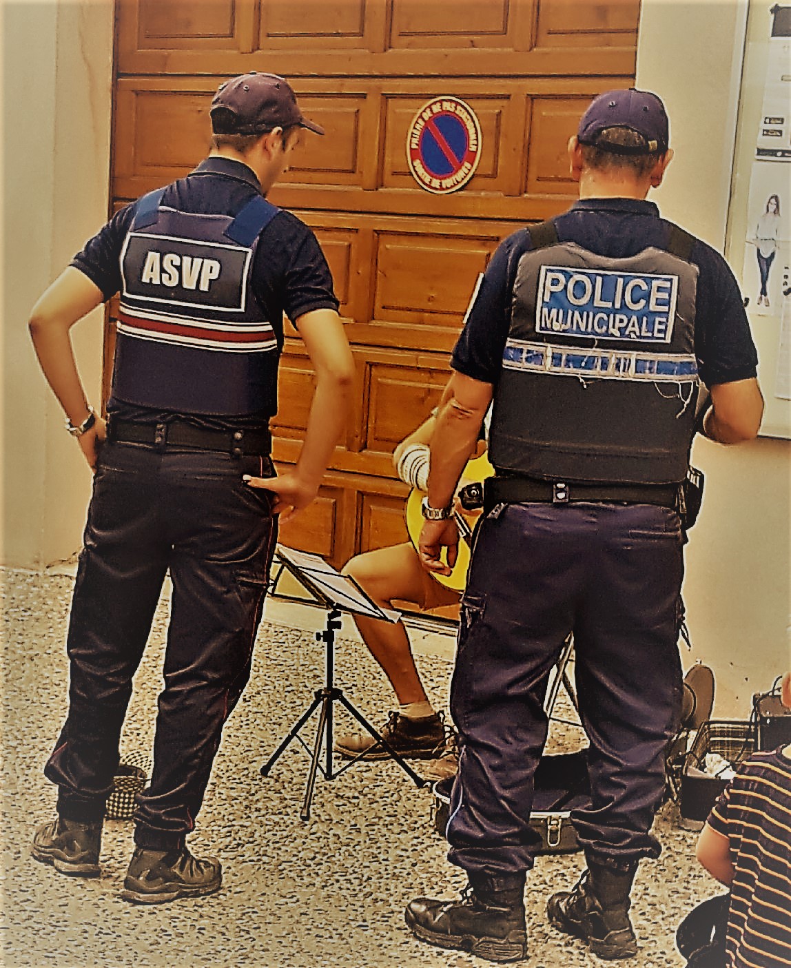 Hij loopt identiek gekleed achter zijn leermeester aan, met als enige verschil de letters op zijn vest en pet: ASVP versus Police Municipale.